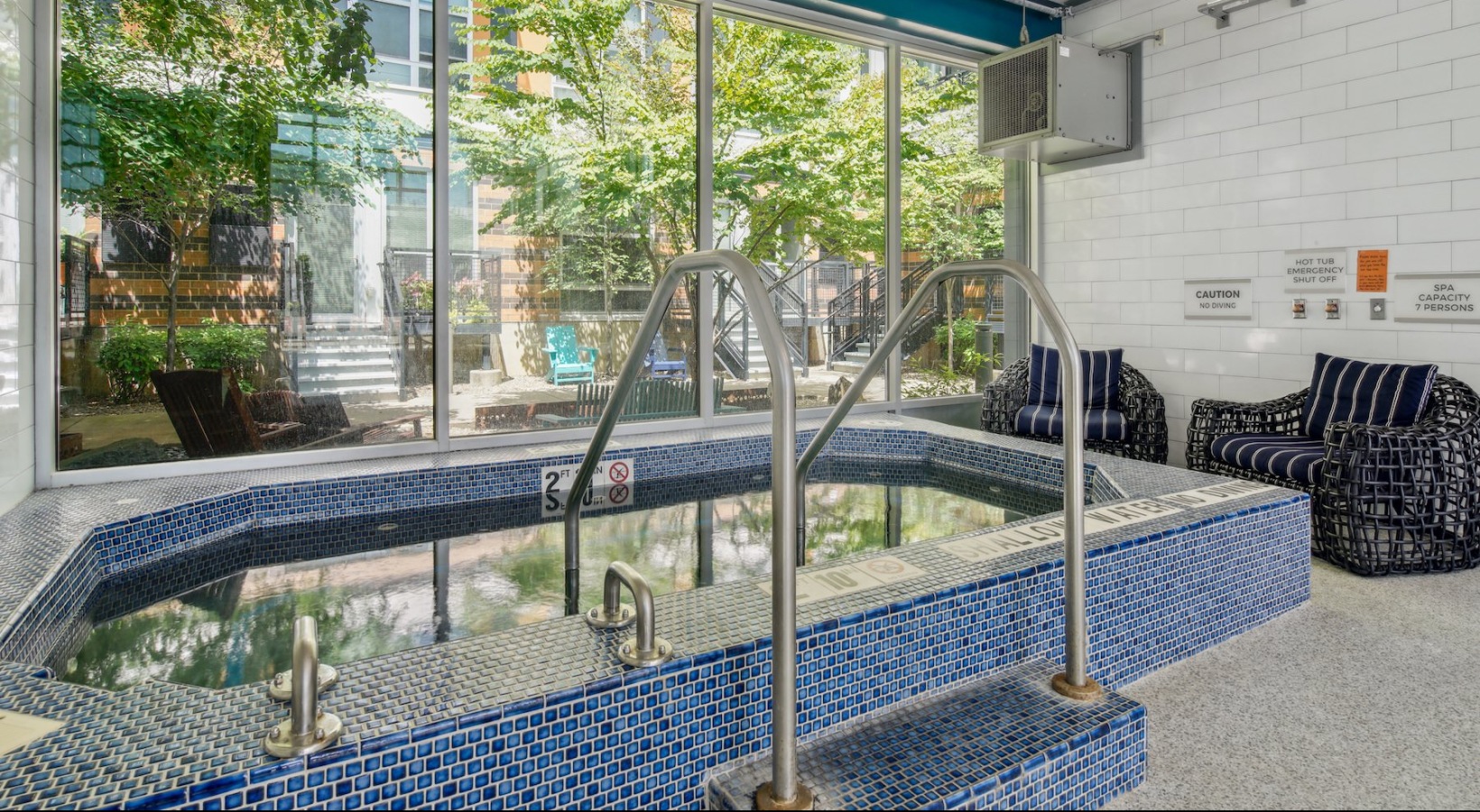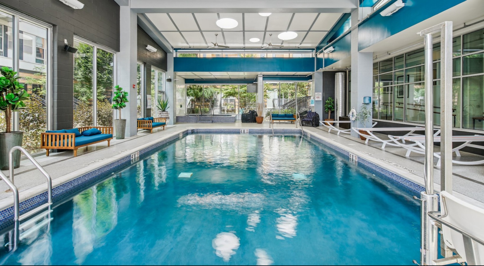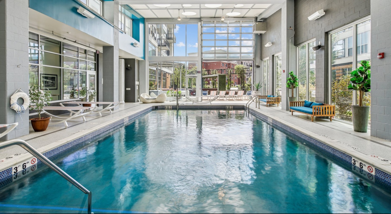 • The indoor pool at Albion at Morrow Park Apartments in Pittsburgh, PA, featuring lounge chairs and couches.